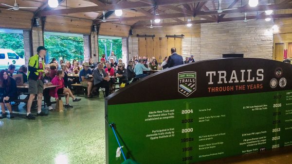 September 27, 2018 – Fort Wayne Trails held a celebration at Shoaff Park’s Conklin Pavilion to recognize all of those individuals who donated to their 100 Mile/ $100K Campaign in early 2018. During the event, Fort Wayne Trails took the opportunity to unveil the sign to recognize those donors, which will be placed at the Towpath Trailhead on Engle Road.