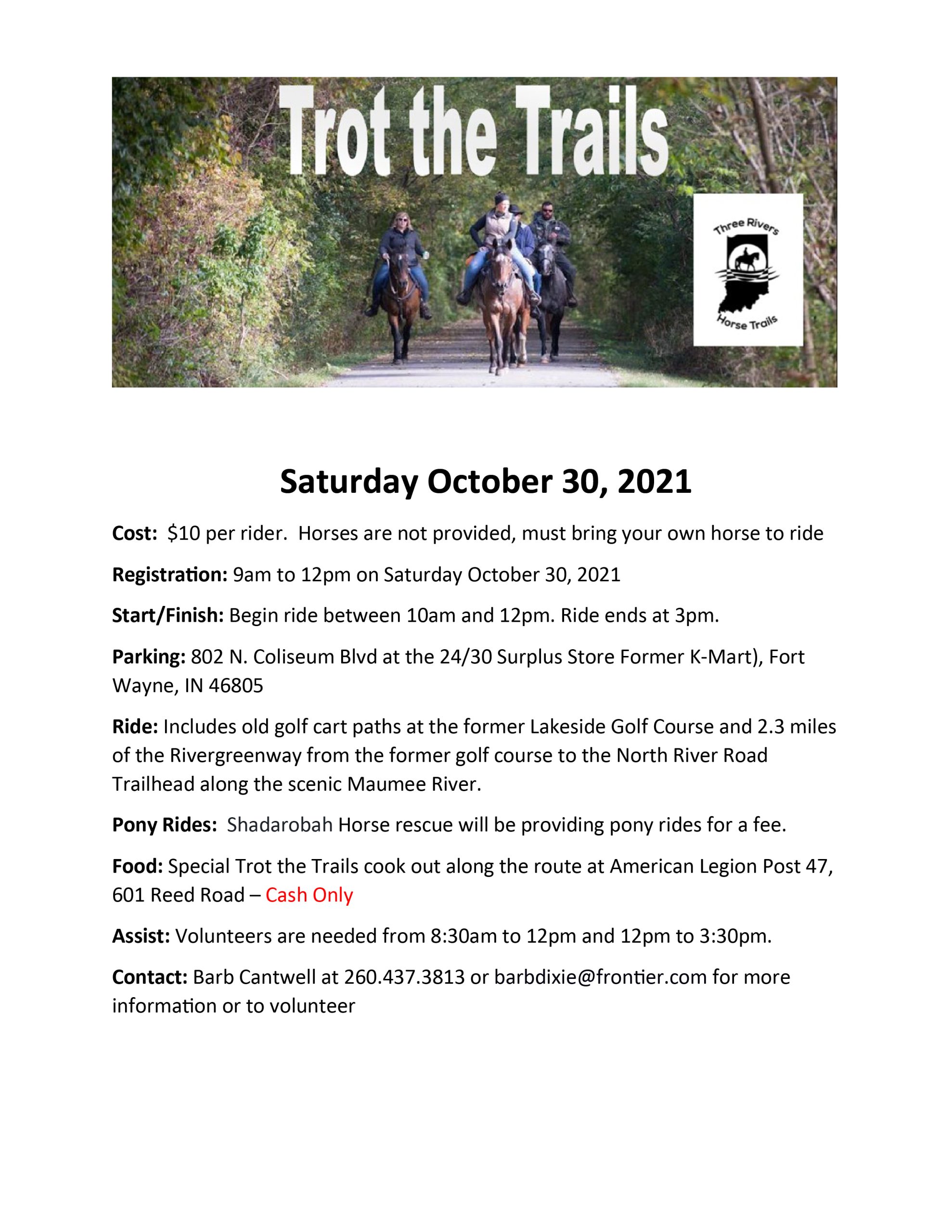 The cost to join the fun is $10 per rider. Participants may begin the ride any time between 10 a.m. and noon and will need to finish by 3 p.m. Registration begins at 9 a.m. the day of the event. Parking is located at 820 N. Coliseum Blvd. at the 24/30 Surplus Store (formerly K-Mart). Other trail users are still welcome to use the same Rivergreenway section during the Trot the Trails event, but they must yield to the horses.