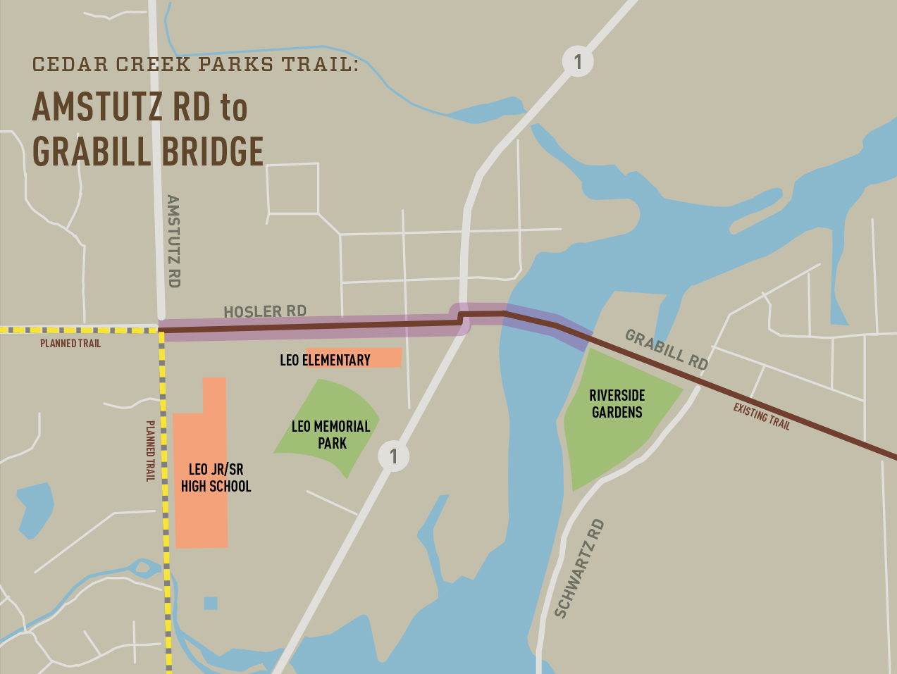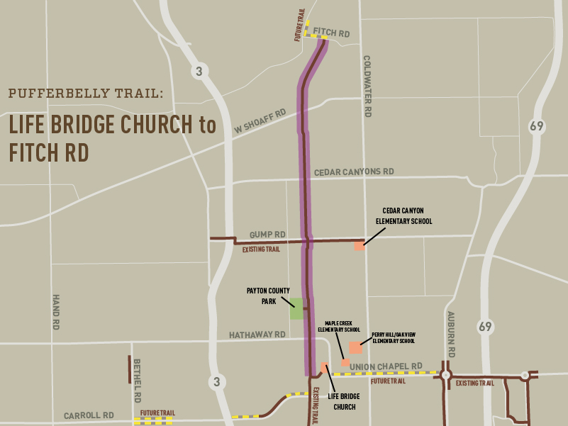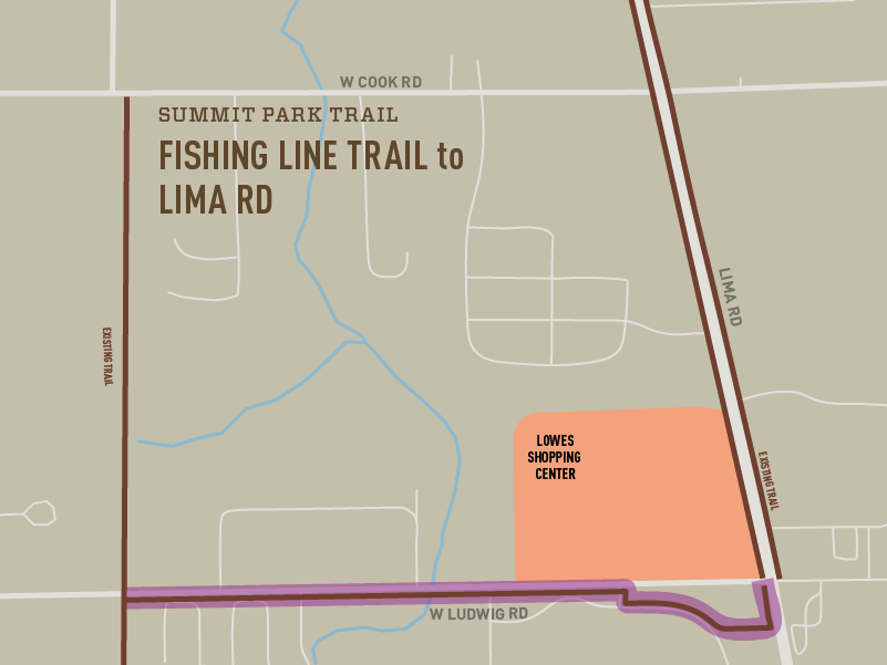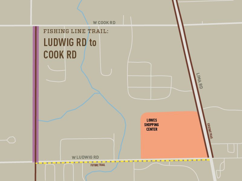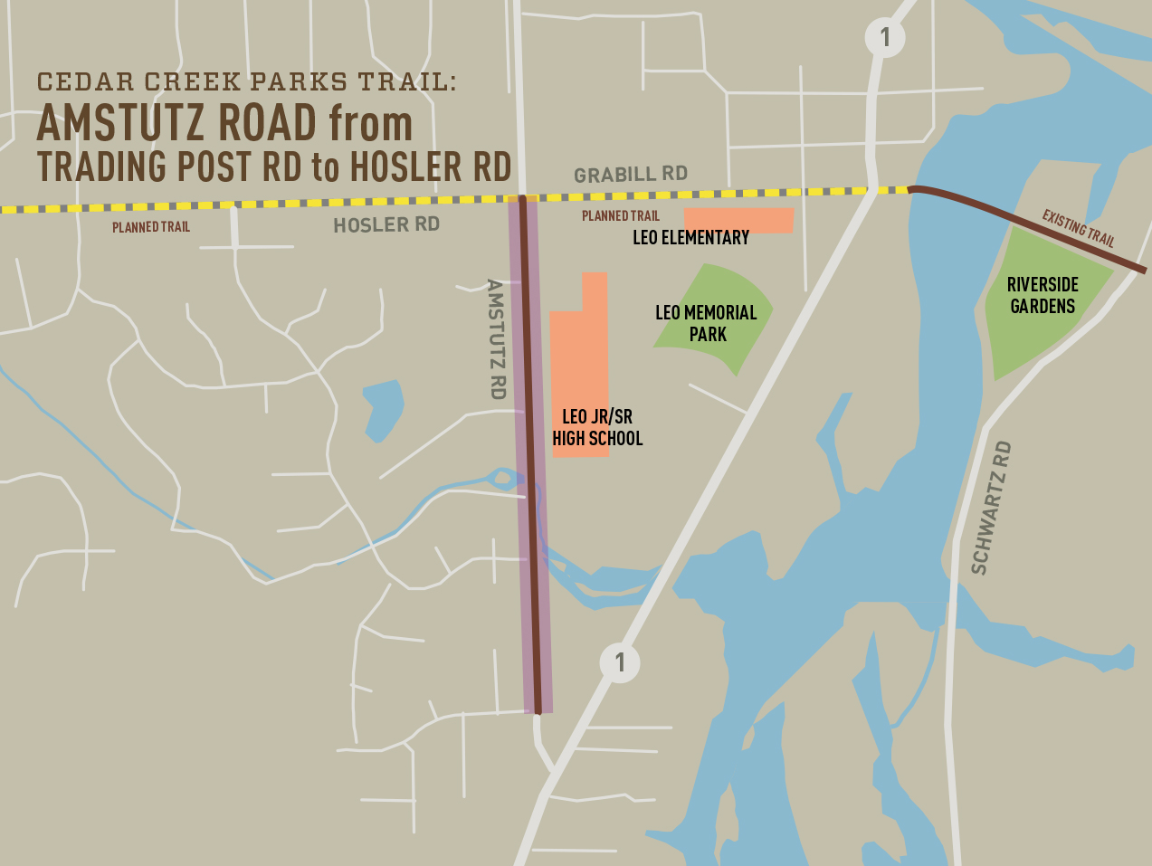 Description: A 10′ wide trail on the east side of Amstutz Rd. will extend from Trading Post Rd. to Hosler Rd. This connects to the Leo Schools’ campuses. The northern section of this trail is a federally-funded project along with the widening of Amstutz Rd.