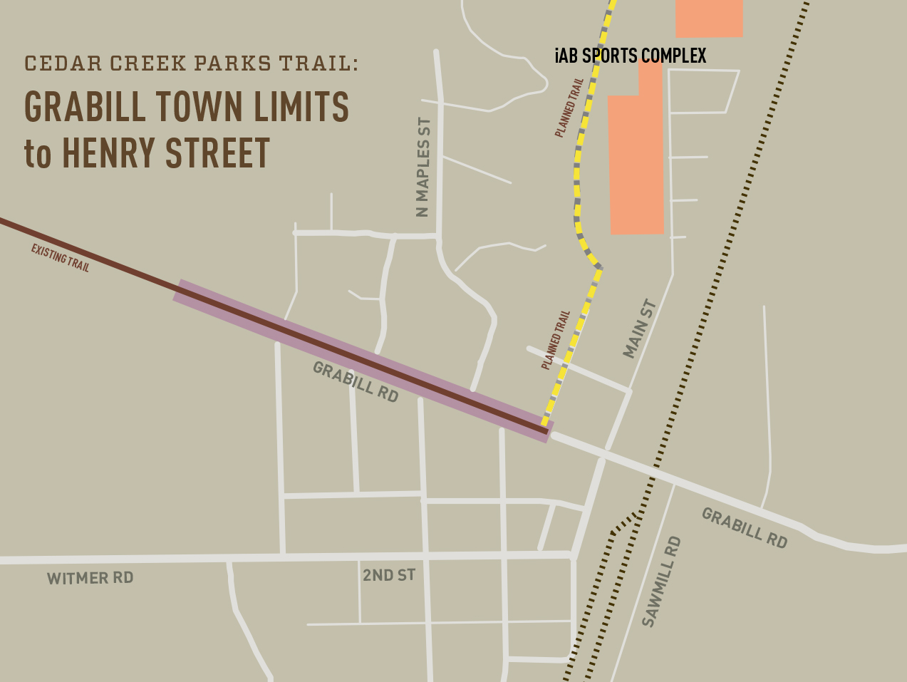 Description: Due to a NIPSCO substation trail users will be routed north on Henry St, east on North St and then north on Main St. There will be 6′-8′ sidewalks on Henry and North St with sharrows on the road for cyclists. There will be 5′ sidewalks and sharrows along Main St. to Grabill Park where the trail resumes to the Leo-Grabill Sports Complex. Sharrows will also continue along Main St. This is a complimentary project in the NewAllen Alliance Stellar Projects from 2019-2023.