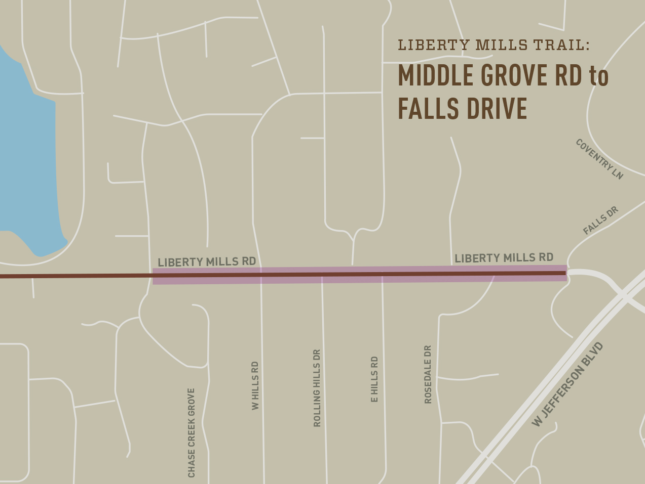 Description: The City of Fort Wayne has a TIF (tax) district that will fund this project during the next few years. The trail will connect the existing trail on Liberty Mills Road, crossing to the north side at Middle Grove and continuing east to Falls Drive and the Village of Coventry Shopping area. Pre-construction meeting has been held. Utilities continue relocations. Construction is 95% complete. A ribbon cutting will be held in late August.