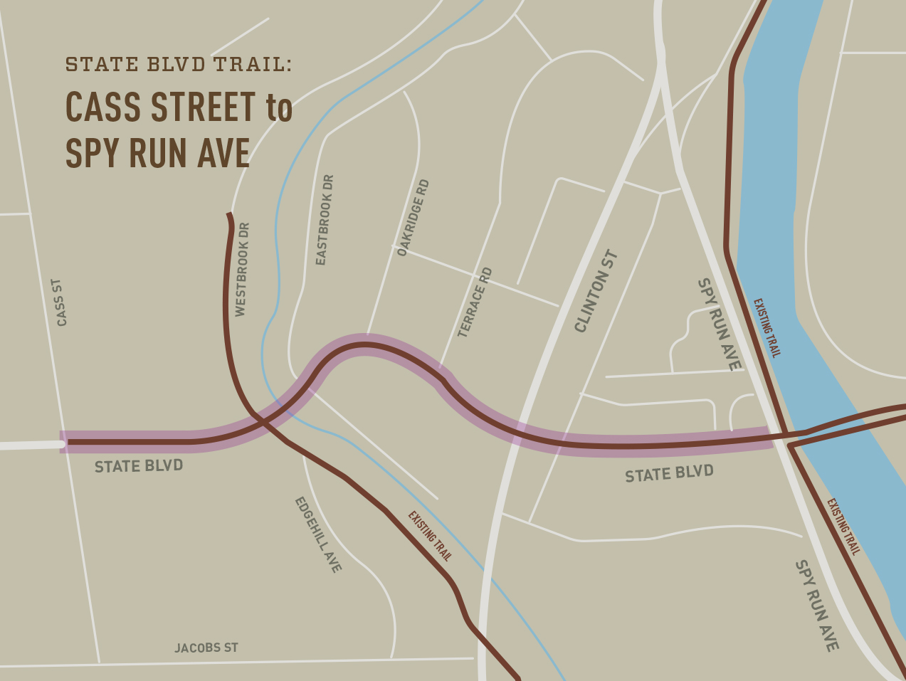 Description: Road Widening and straightening project that will include a sidewalk, trail and the Pufferbelly Trail Bridge. 8′-10′ wide trail will run from the Pufferbelly Trail to the Rivergreenway on the south side of State. Trail is currently open from Clinton St. to Spy Run Ave. and the Rivergreenway. Phase 2, from Cass St. to Clinton St. will be constructed in 2019 and 2020. Construction has begun. Contractors will work on new retaining walls and the pedestrian bridge for the Pufferbelly Trail through summer, 2020. Trail along State Boulevard will follow, during the summer of 2020. This project was completed in the Fall of 2020.