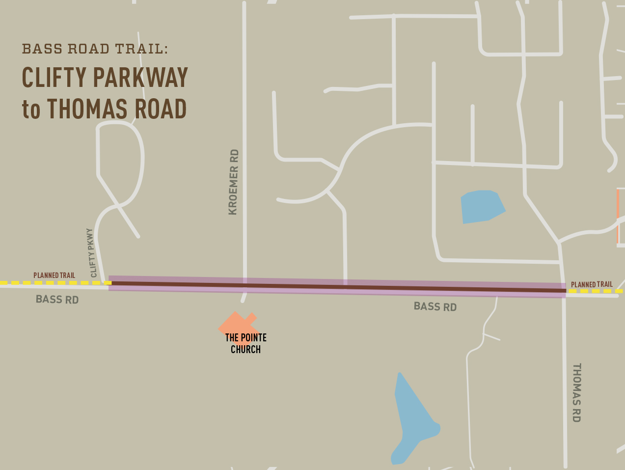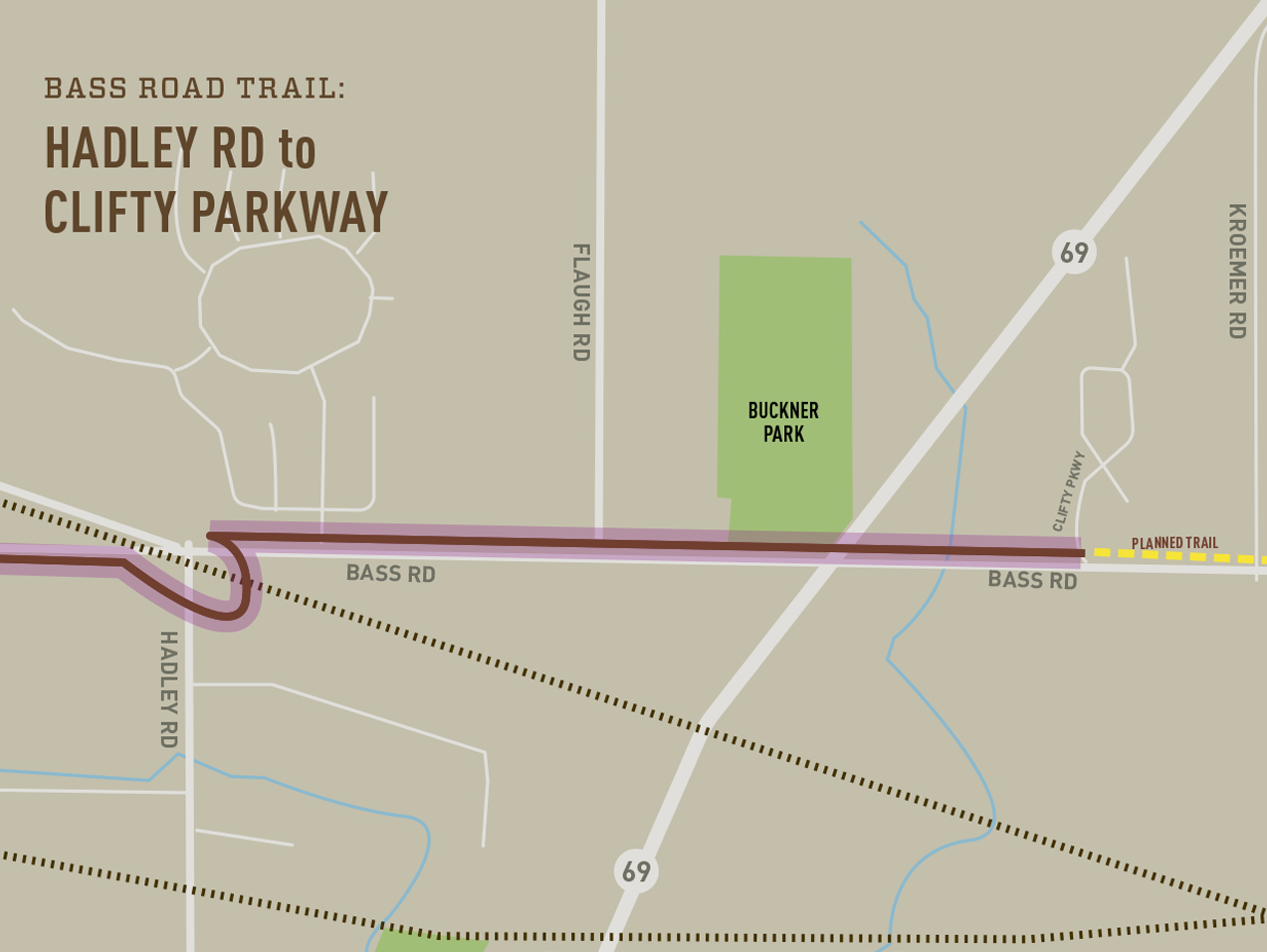 Description: The Allen County Highway Department is building a 10′ wide multi-purpose trail along Bass Road as part of the road-widening project in several phases between 2017 and 2023. This trail will be constructed along the north side of the road between Clifty Parkway and Thomas Road. This phase of the project was bid in March of 2021. From just west of Thomas to Clifty Parkway was completed in September and is open.