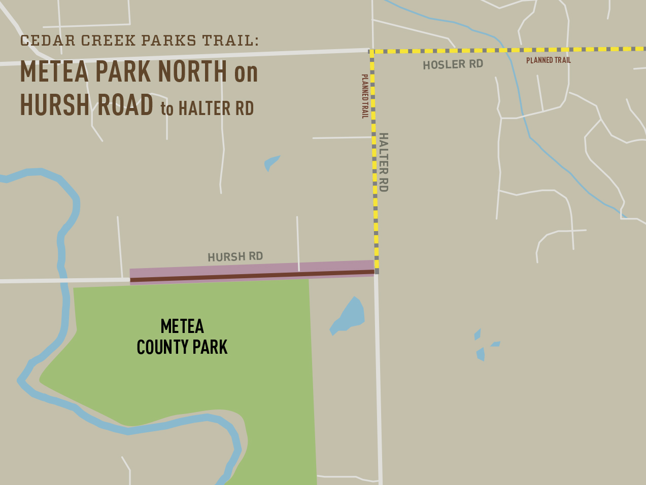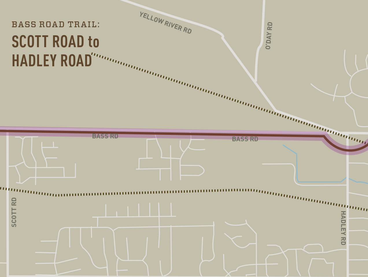 Design and Engineering is completed for the entire 4.3-mile stretch of trail. The trail will also include a new trailhead just north of Shoaff Rd and a turn-around loop and rest area at Fitch Rd.