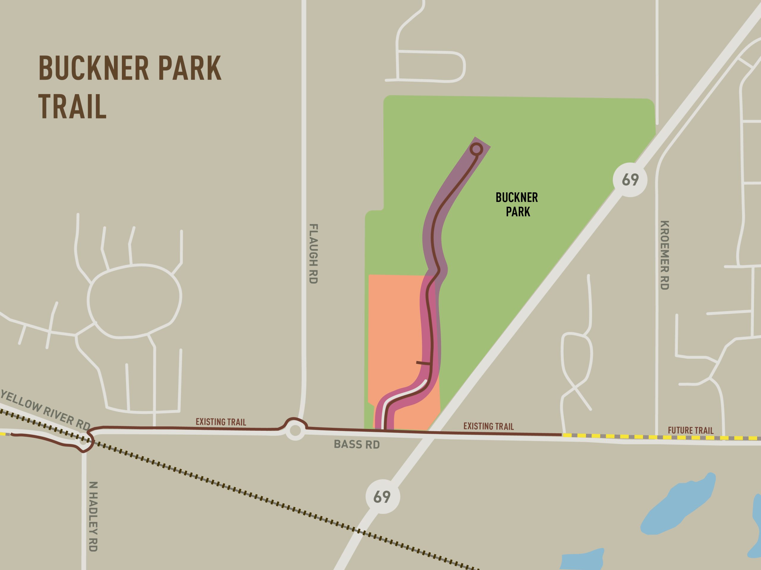 Description: 8ft wide asphalt trail from the newly constructed Bass Rd Trail heading north into the park. The trail will provide park benches in several locations with scenic overlooks. The trail will run parallel to the Flaugh Ditch for a distance, providing views of the stream. At the north end of the trail there will a loop as a turn around with a picnic area and open-air pavilion. The trail will connect to the existing splash pad, pavilion, playground, and stone trail.