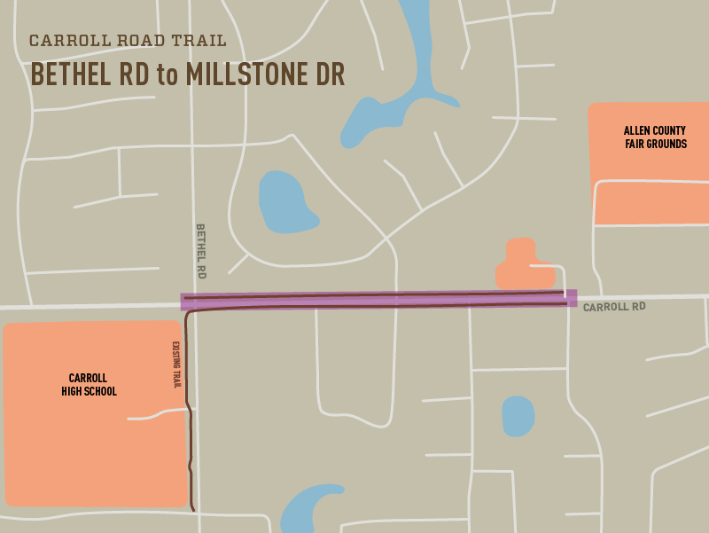 Description: 8ft trail on both sides of Carroll Rd from the existing trail on Bethel Rd to Millstone Dr. The trail on the north side of Carroll Rd will also connect to the fairgrounds. INDOT has awarded the project to E&B Paving. Pre-construction meeting has been held. The road expansion is slated for substantial completion in the fall of 2024 with the trail and pedestrian facilities in the spring of 2025.