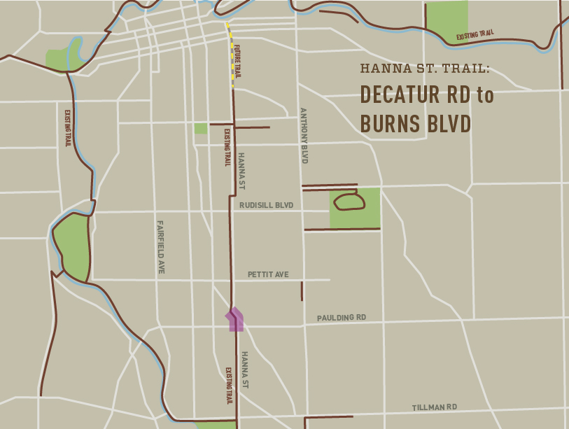 Description: This extension and final piece of the southern sections of the Hanna Street Trail will be an 8′ concrete trail on the west side. It will complete the Hanna Street Trail from E Wallace St to Tillman Park.