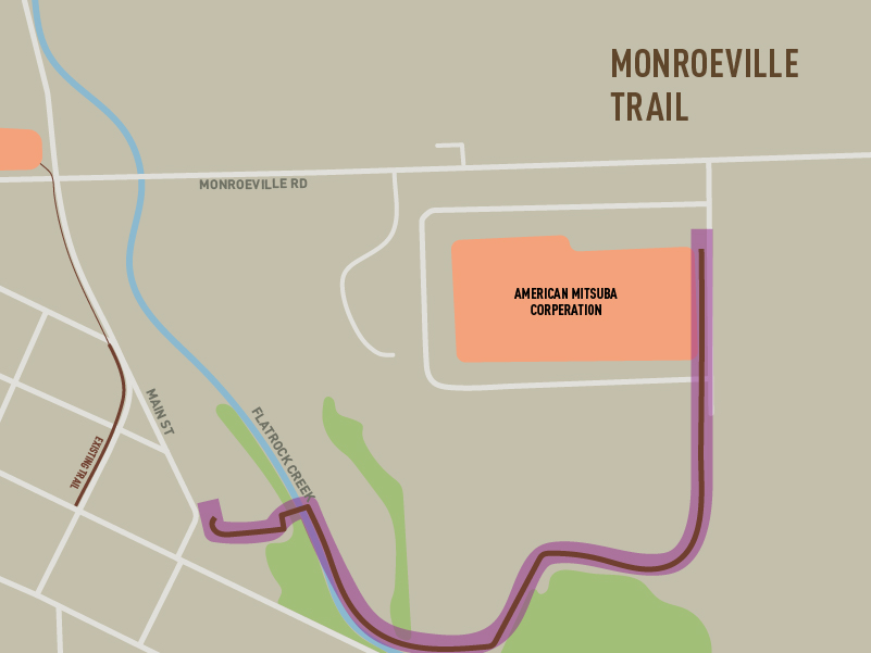 Description: This trail will start at the trailhead within the former Conversation Club property, head east through the woods and across Flat Rock Creek onto town-owned property behind CME then north to Monroeville Road. Moving forward in the INDOT process. This project was bid and the bid was approved by INDOT and Monroeville. Construction is complete.