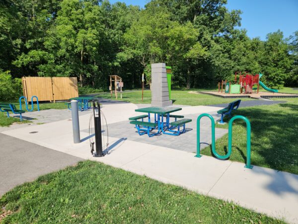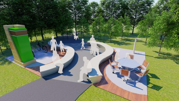 taking a long walk with the family on a new section of trail and discovering a spot along the side – a Trail Hub built just for you. The benches are designed for easy conversation, and there’s ample room to play and explore. Other families are there as well, and the kids begin to play tag.