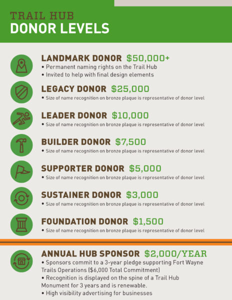 These Trail Hubs not only help fund the development of nearby trail projects, continued maintenance needs, and overall support for Fort Wayne Trails, Inc, but also allow donors to leave a legacy that will benefit trail users for generations.